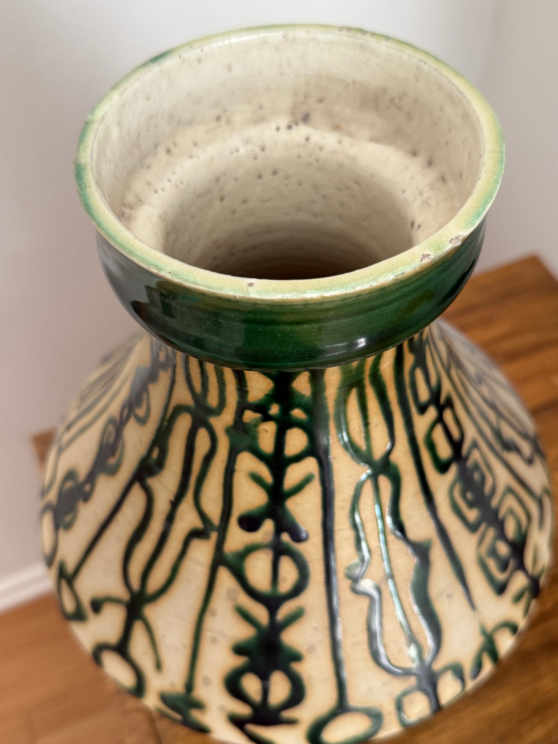 Hieroglyphic-reminiscent. Drippy glaze associated with a style of pottery practiced in Europe in the 60s. Timeless shape. Sourced in San Fran.