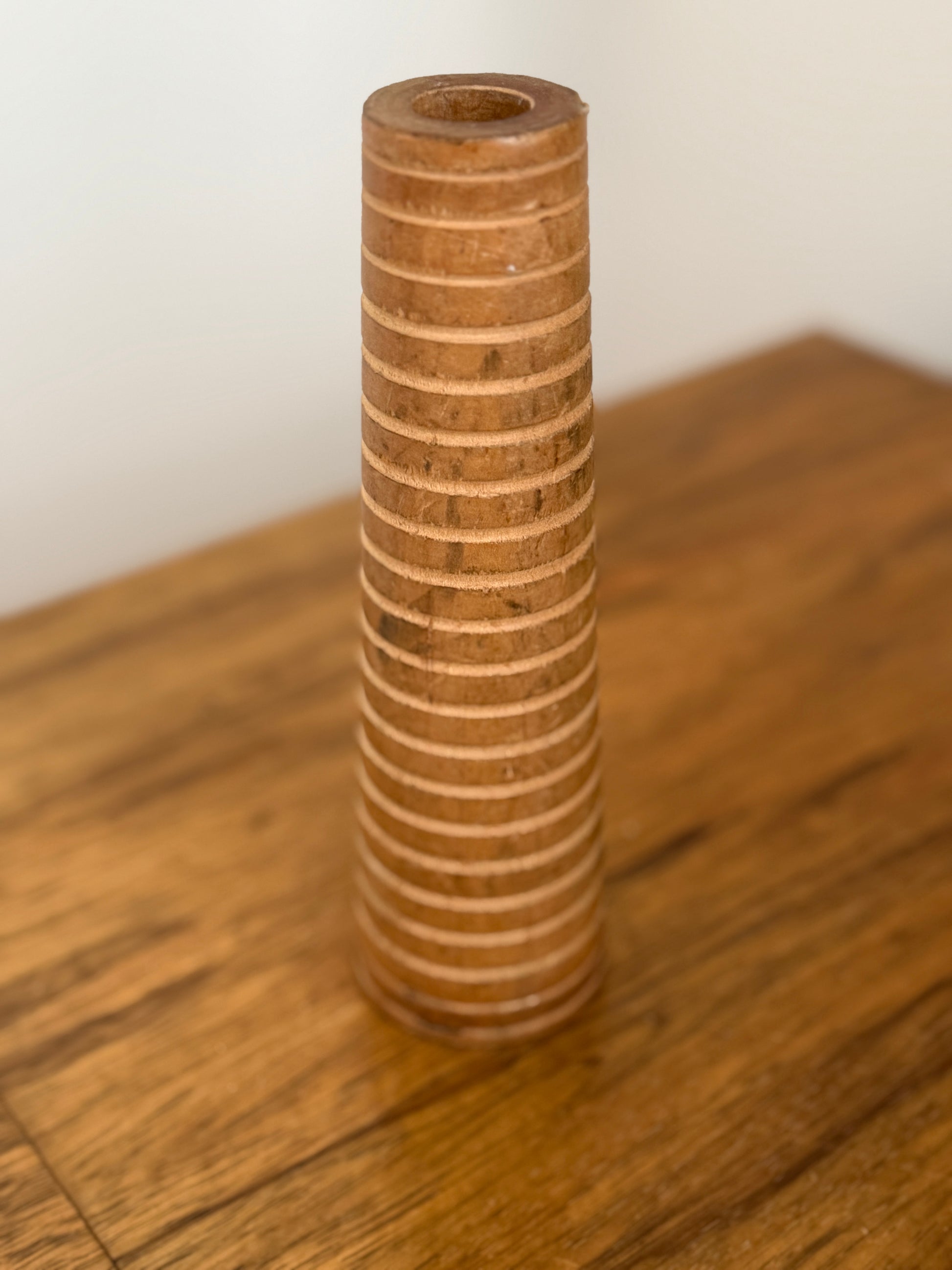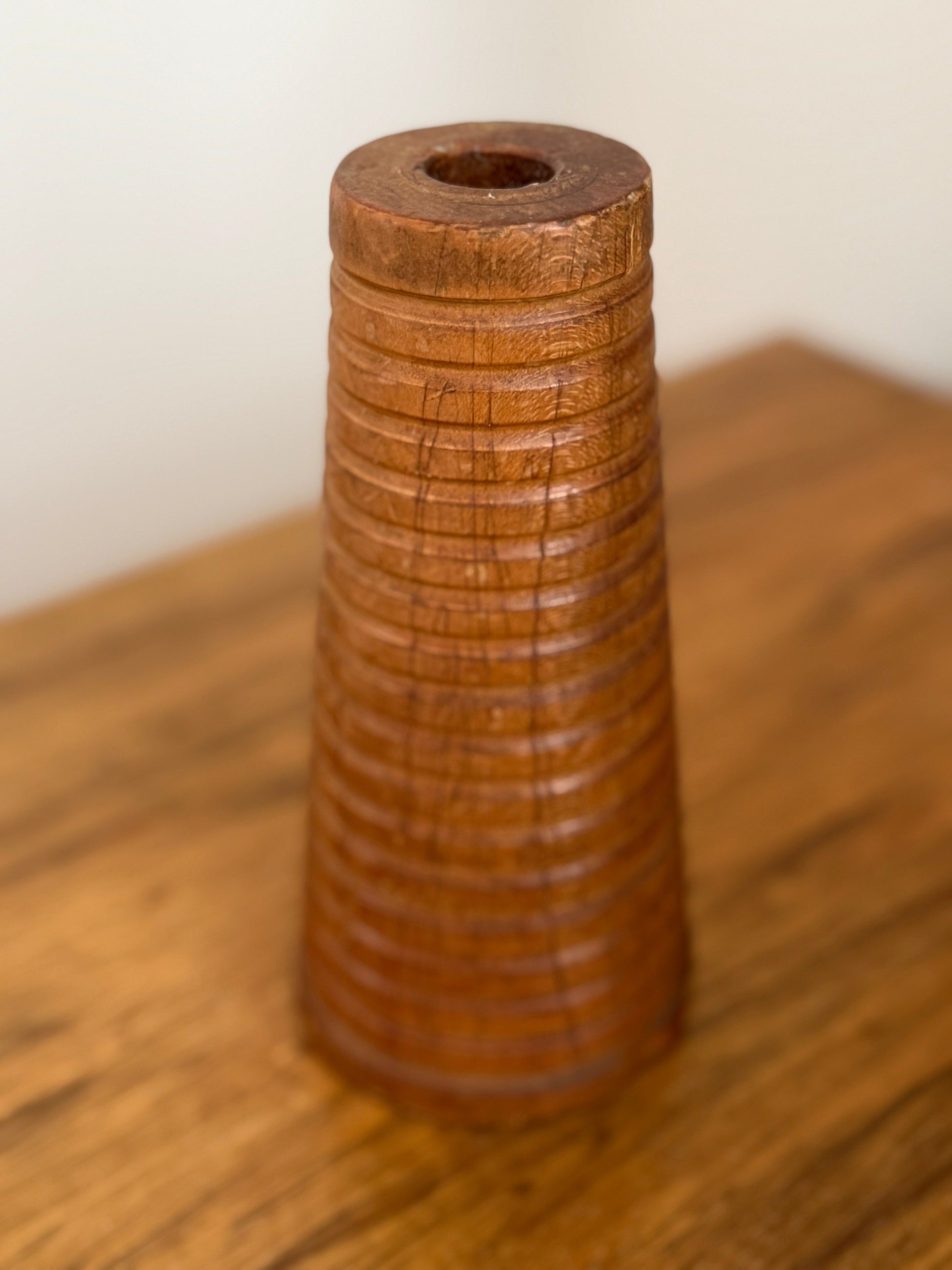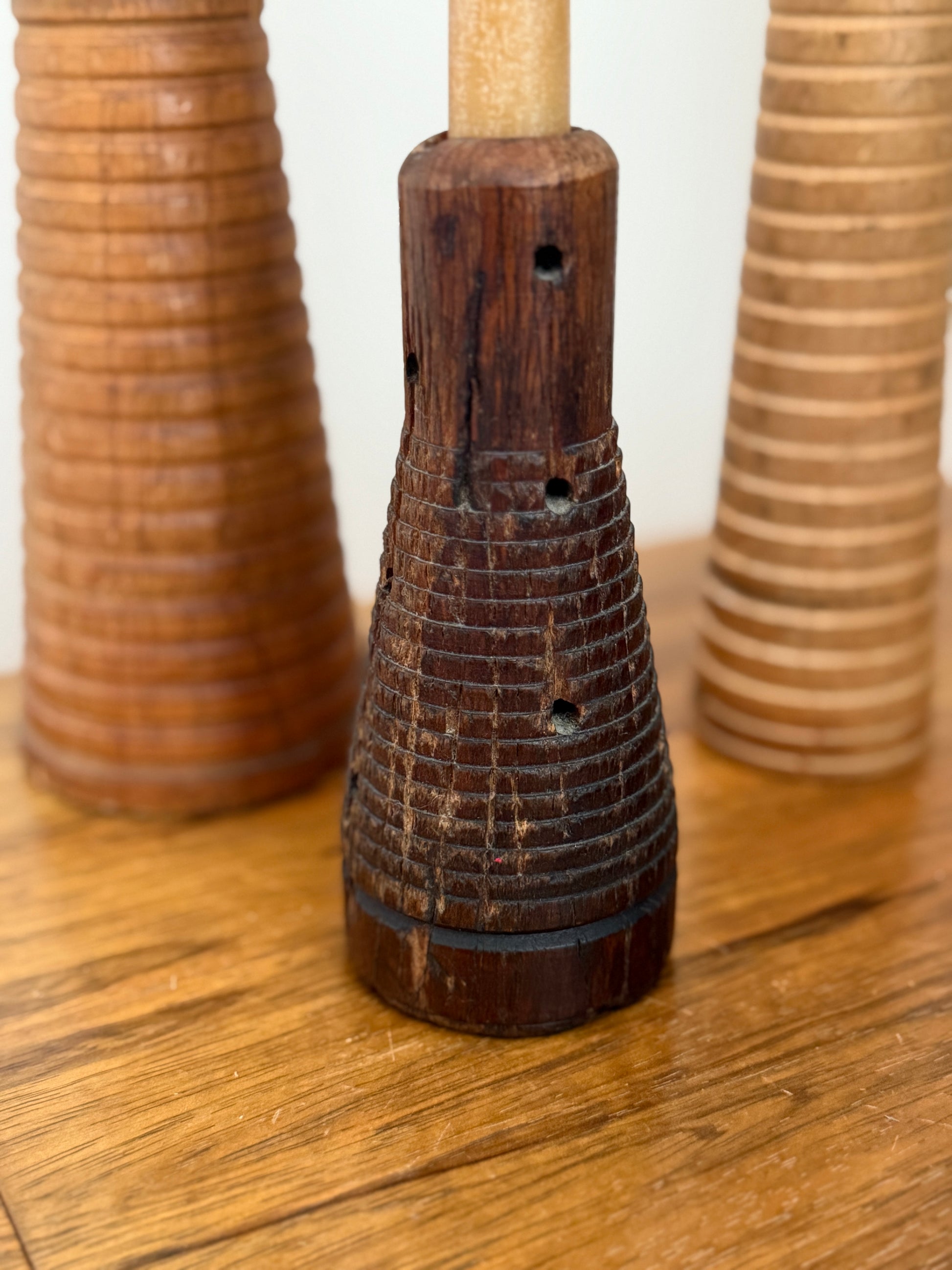 Antique wooden bobbins or spools used in the textile industry during the Industrial Revolution. Their modern use is as decorative object or candleholders. 2 of 3 in the set can hold a candle on both ends (see pics, shown both ways), while the 3rd, has a brass insert in the base pin hole.