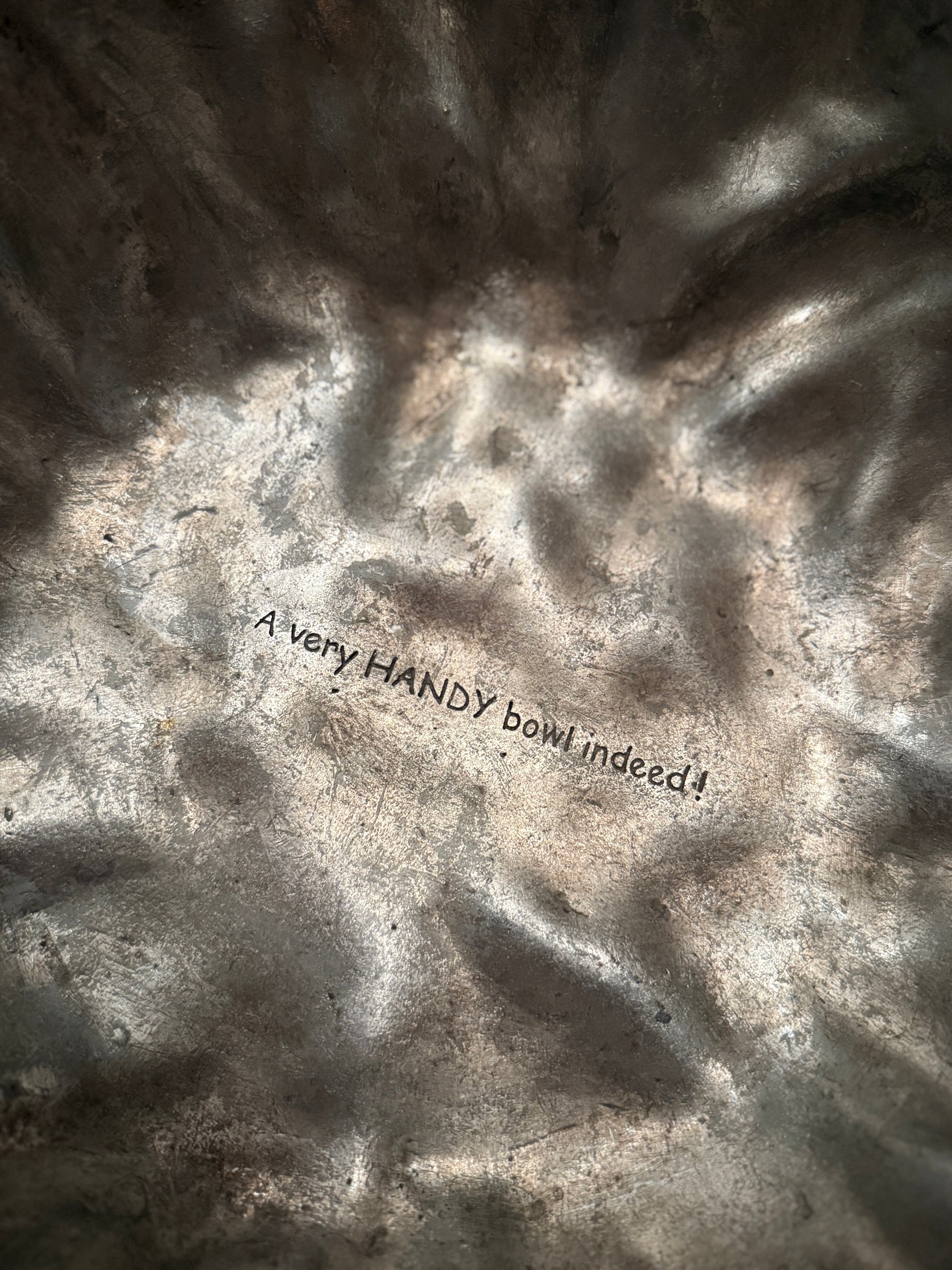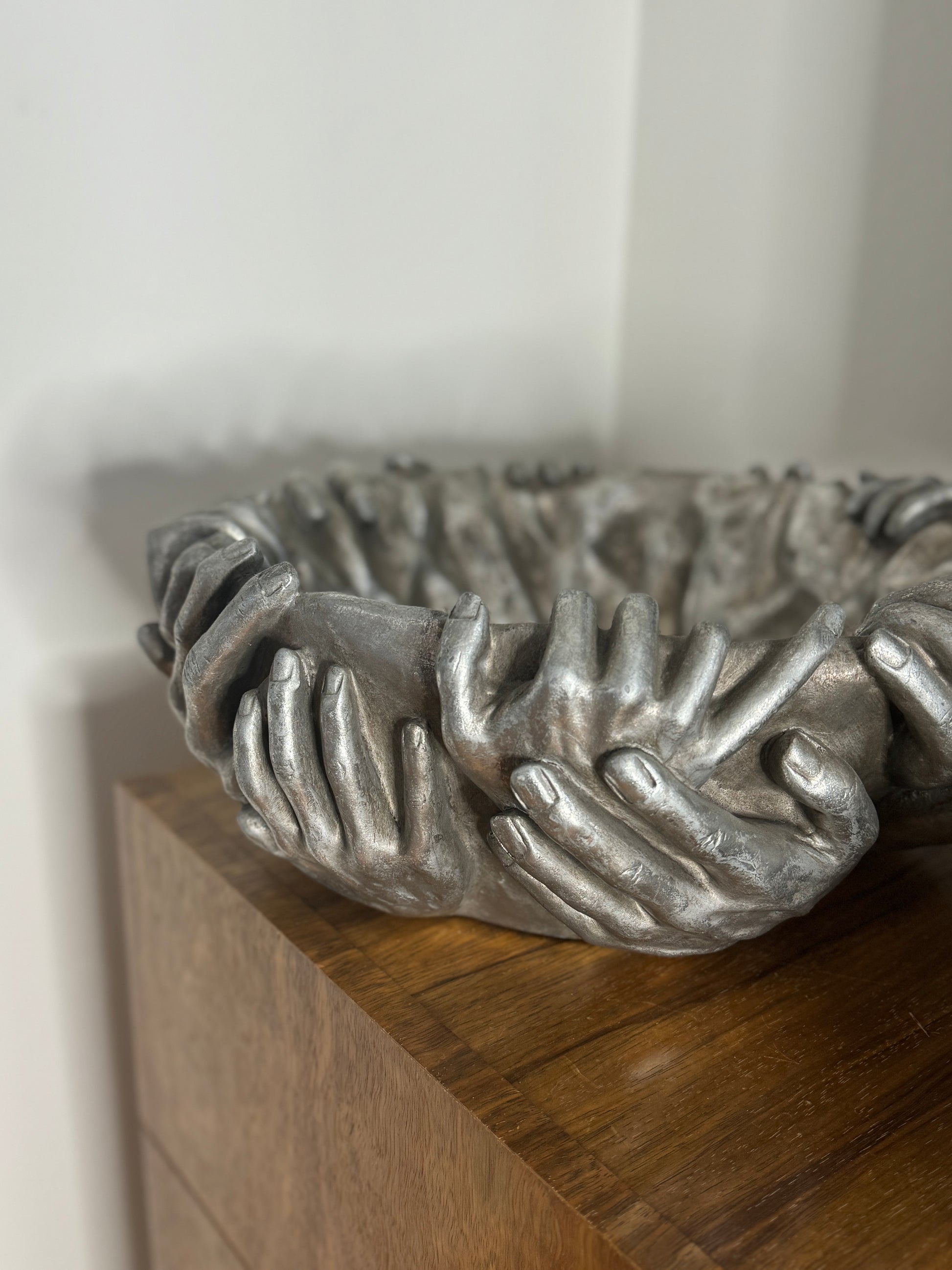 The original, collectible large sculptural bowl wrapped with numerous hands from the discontinued Vitruvian Collection entitled, "A Very Handy Bowl Indeed." This design has been knocked off by a very famous brand. Don't believe the dupe; this is the real deal!