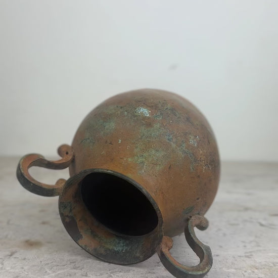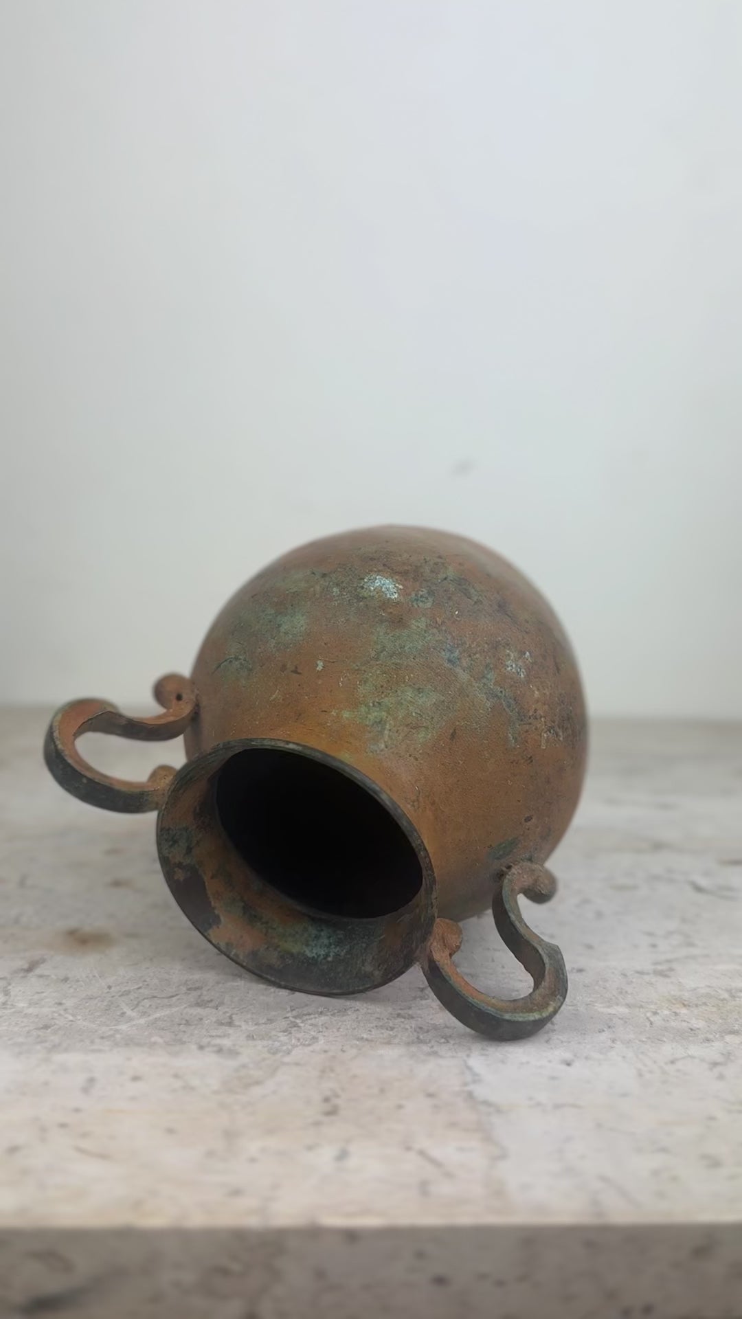Gorgeous patina of copper and blue/green colors, this classic vessel is in the style of a Roman or Greek amphora. Lovely piece.