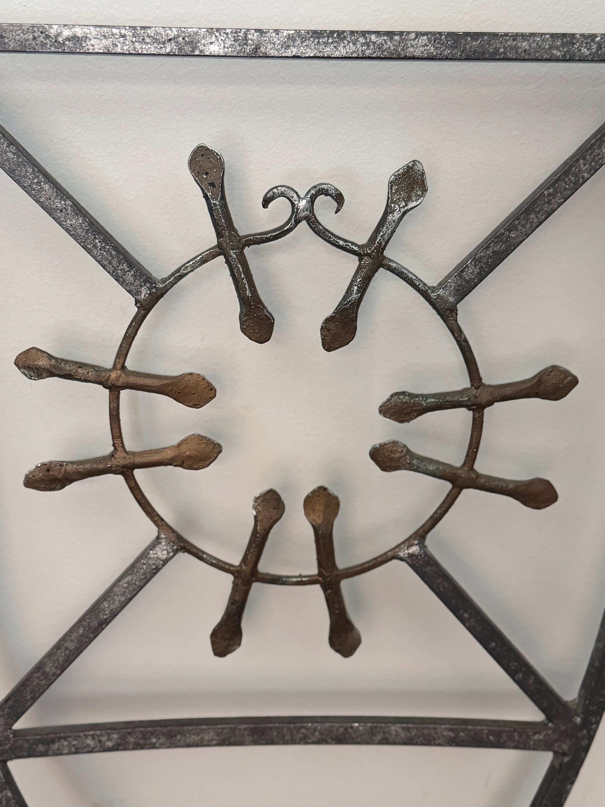 A stunning chair that doubles as art. Semi-reminiscent of Maison Jansen with an edge, this looks and feels like a collector's piece. Iron with brass accents. Heavy, sturdy, gorgeous.